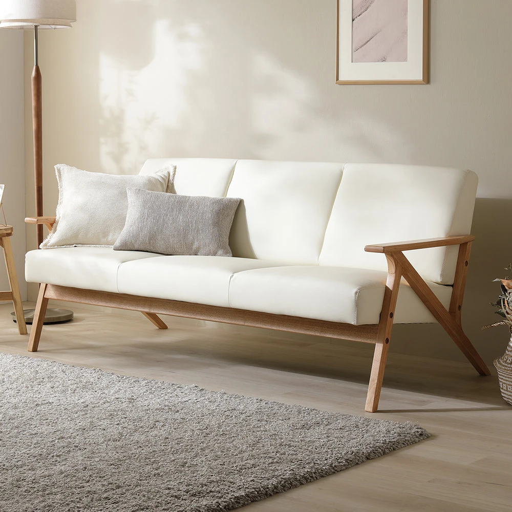 直線的なフレームで空間を引き締める上質なレザーソファ クリームアイボリー 3人掛け