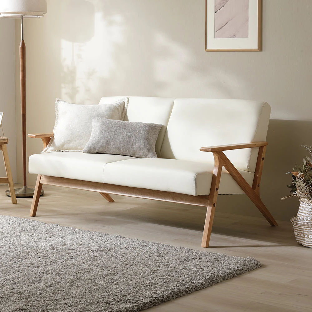 直線的なフレームで空間を引き締める上質なレザーソファ クリームアイボリー 2人掛け