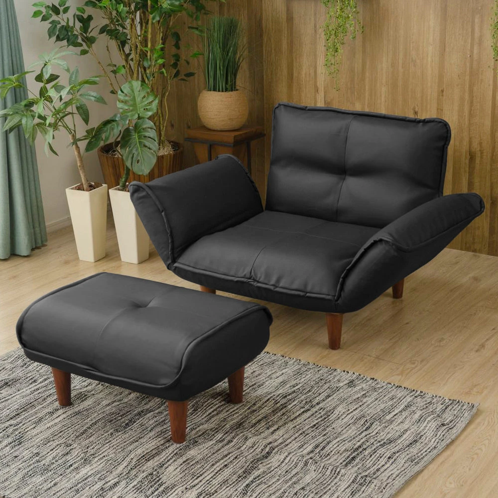 静かに角度を変えて姿勢を整える日本製のレザーソファ PVC ブラック 1人掛けカウチ(1人掛け+オットマン)