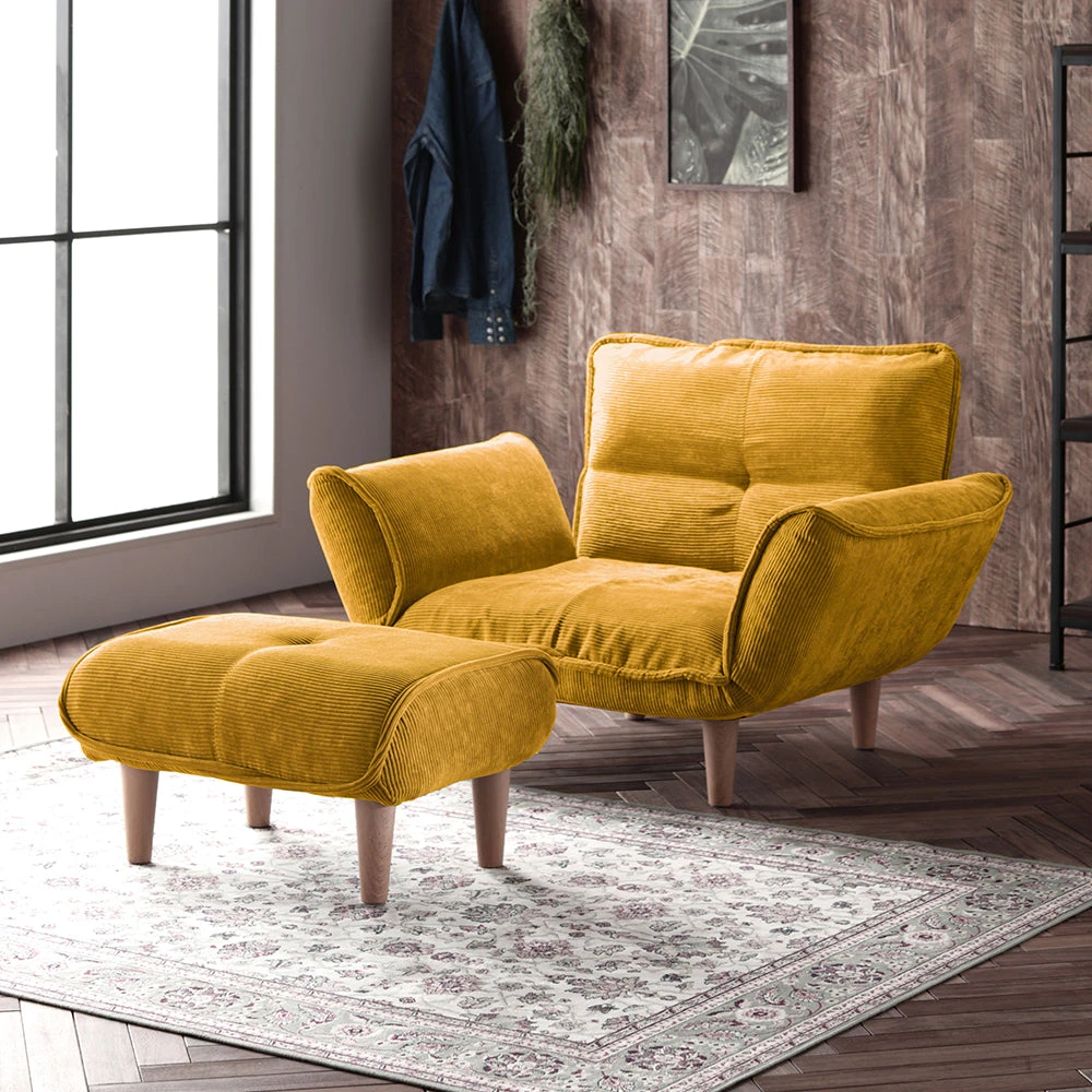 静かに角度を変えて姿勢を整える日本製のレザーソファ コーデュロイ イエロー 1人掛けカウチ(1人掛け+オットマン)