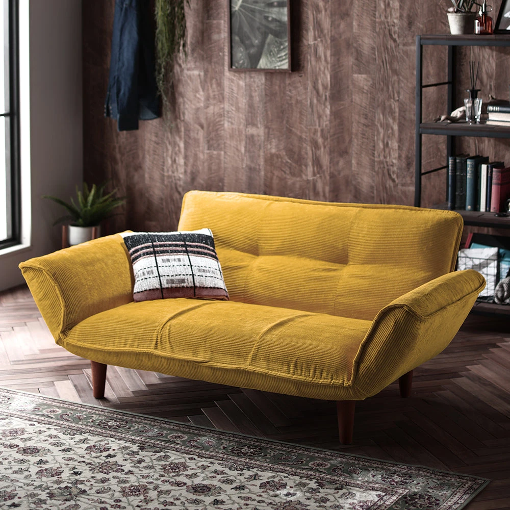 静かに角度を変えて姿勢を整える日本製のレザーソファ コーデュロイ イエロー 2人掛け単品