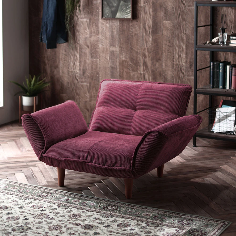 3静かに角度を変えて姿勢を整える日本製のレザーソファ コーデュロイ ワインレッド 1人掛け単品