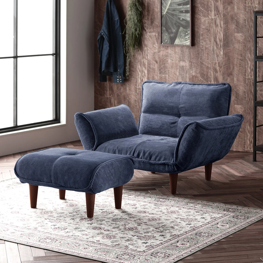 静かに角度を変えて姿勢を整える日本製のレザーソファ コーデュロイ ブルー 1人掛けカウチ(1人掛け+オットマン)