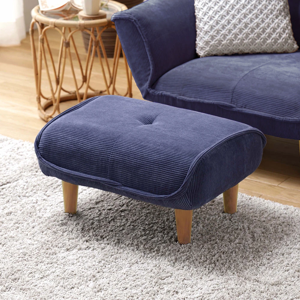 静かに角度を変えて姿勢を整える日本製のレザーソファ コーデュロイ ブルー オットマン単品