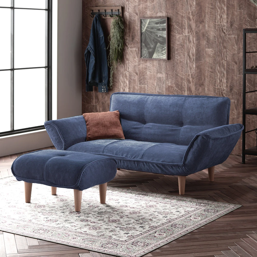 静かに角度を変えて姿勢を整える日本製のレザーソファ コーデュロイ ブルー 2人掛けカウチ(2人掛け+オットマン)