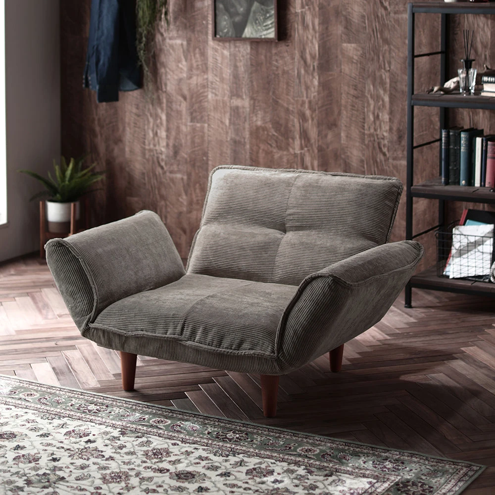 静かに角度を変えて姿勢を整える日本製のレザーソファ コーデュロイ チャコールグレー 1人掛け単品
