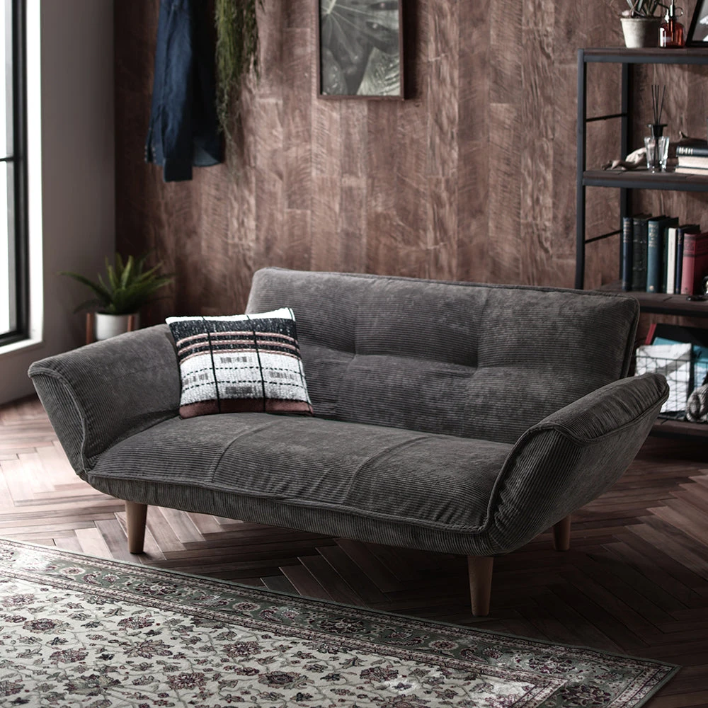 静かに角度を変えて姿勢を整える日本製のレザーソファ コーデュロイ チャコールグレー 2人掛け単品