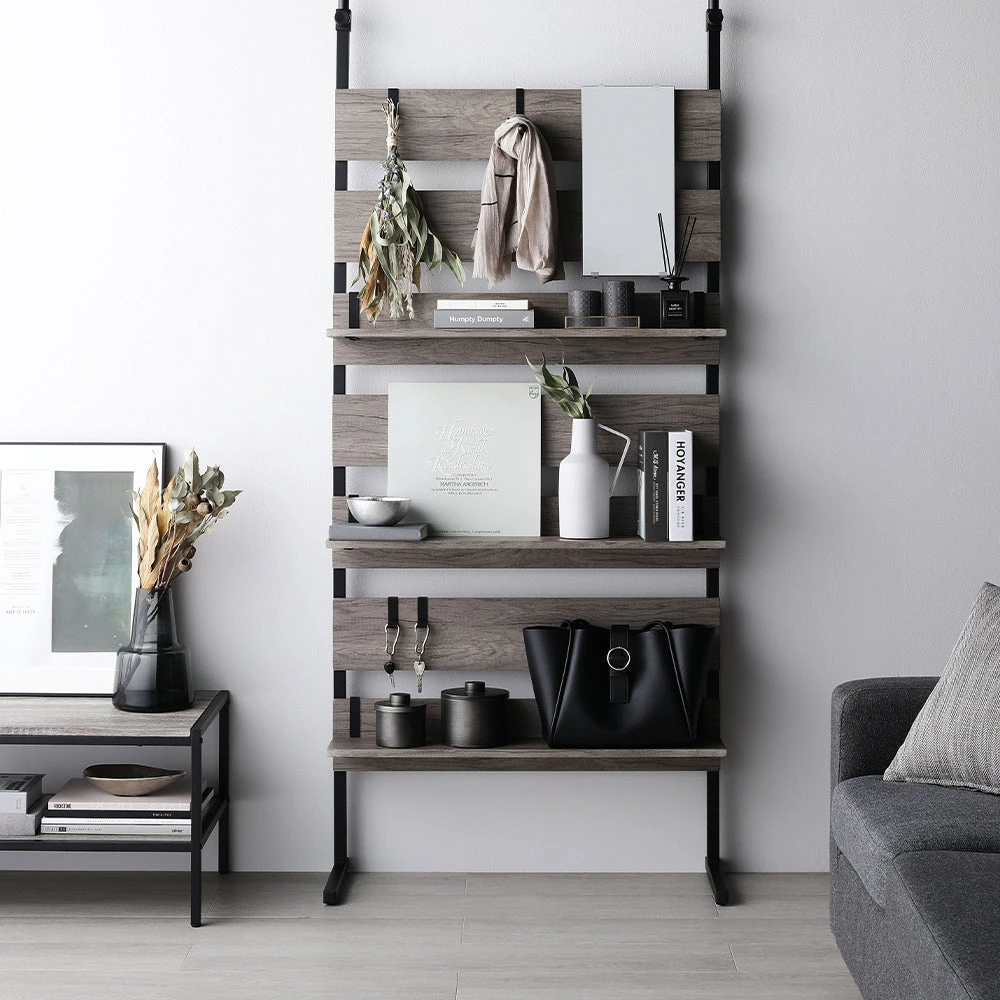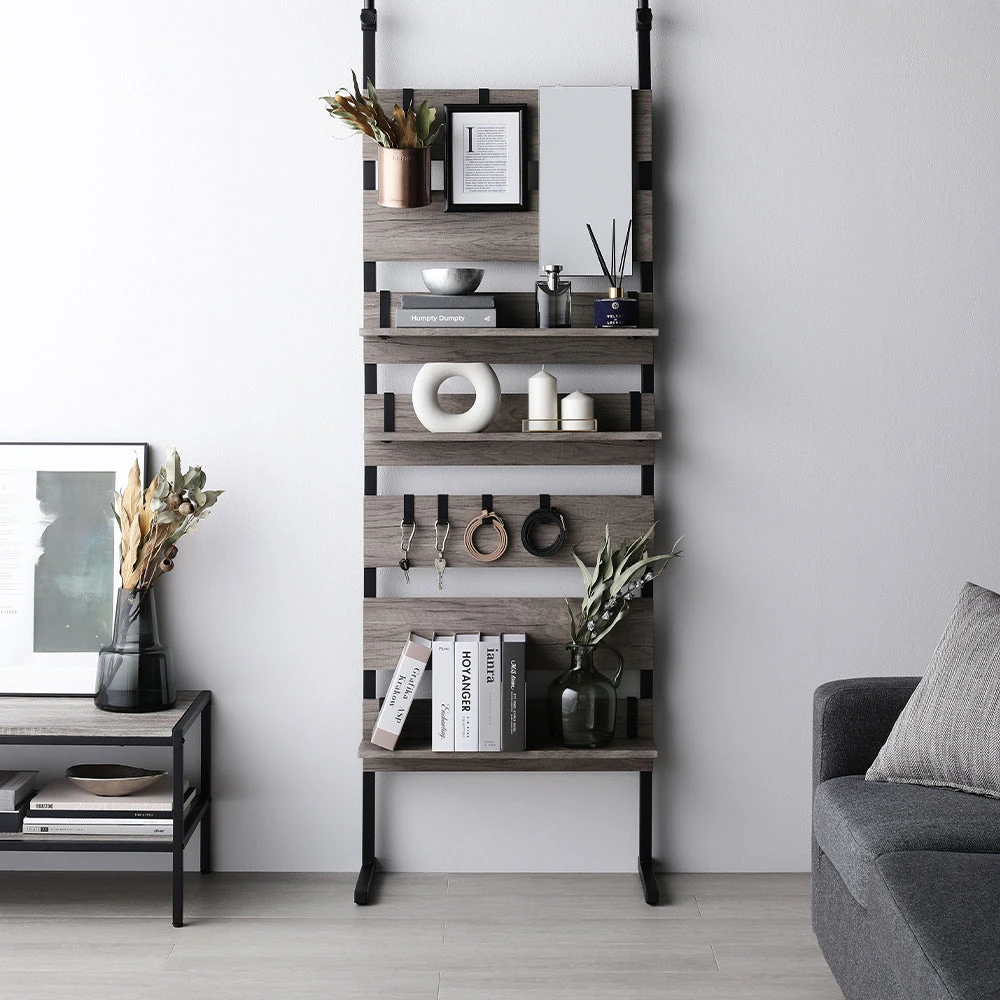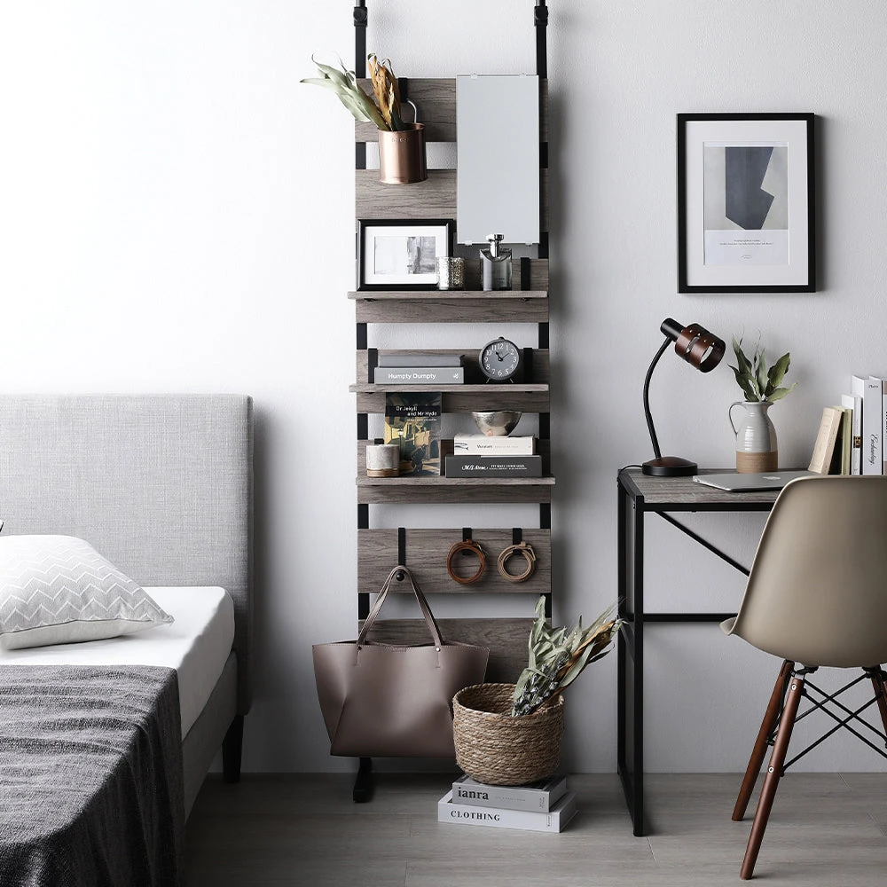 工具不要で手早く設置。可愛い見せ収納が叶う突っ張りウォールラック(ミラー・フック付き) グレージュ×ブラック 幅45cm