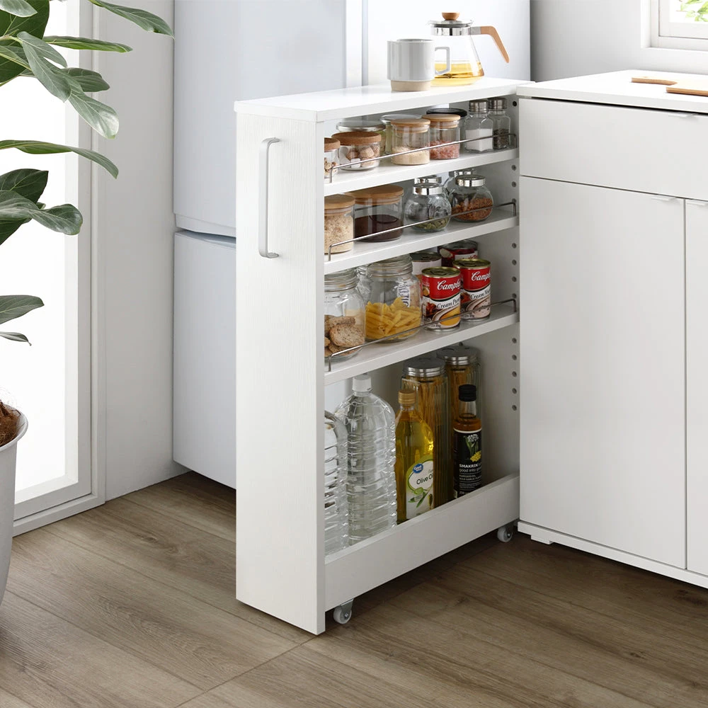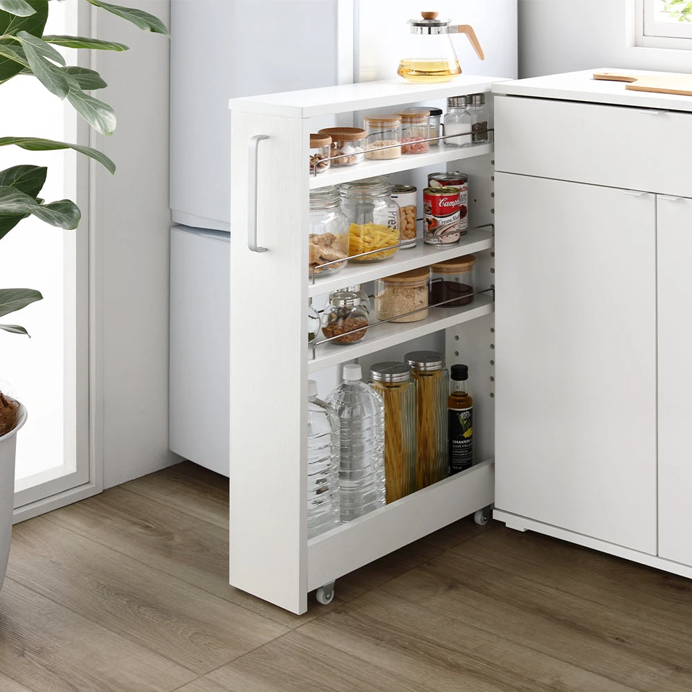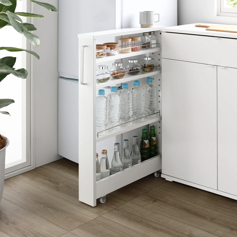 デッドスペースを収納化し、取っ手付きで扱いやすいすき間収納ラック ホワイト ロータイプ(幅14cm)