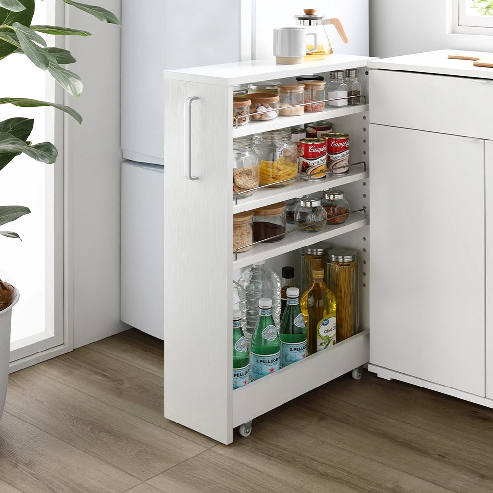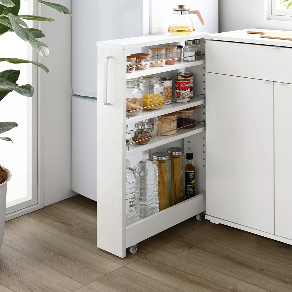 デッドスペースを収納化し、取っ手付きで扱いやすいすき間収納ラック ホワイト ロータイプ(幅18cm)