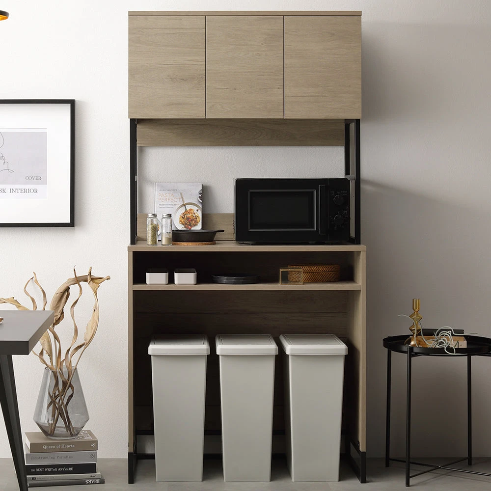 異素材の質感と広い作業面で家事がはかどるキッチンカウンター グレージュ キッチンボード(ゴミ箱収納) 90cm幅