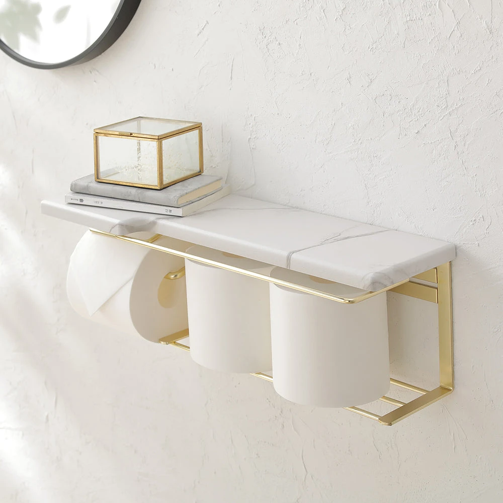 美しい木肌とタオルバーで整い、賃貸でも設置しやすいトイレ収納 大理石調 ホワイト 網棚タイプ