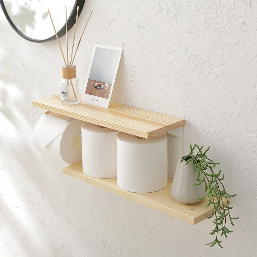 美しい木肌とタオルバーで整い、賃貸でも設置しやすいトイレ収納 天然木 ナチュラル 板棚タイプ