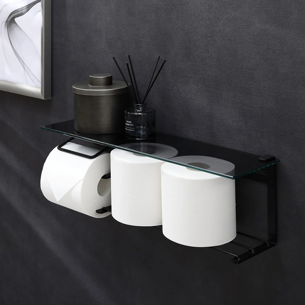美しい木肌とタオルバーで整い、賃貸でも設置しやすいトイレ収納 ガラス ブラック