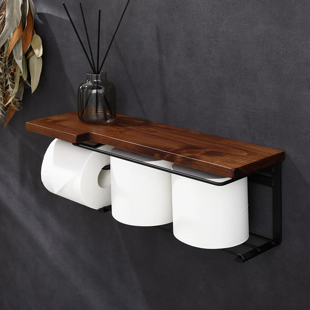 美しい木肌とタオルバーで整い、賃貸でも設置しやすいトイレ収納 天然木 ダークブラウン 板棚タイプ