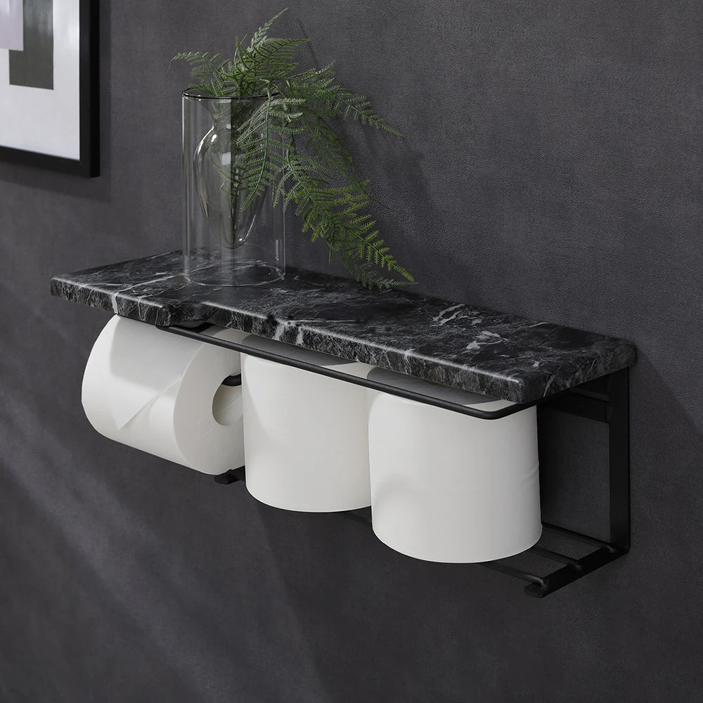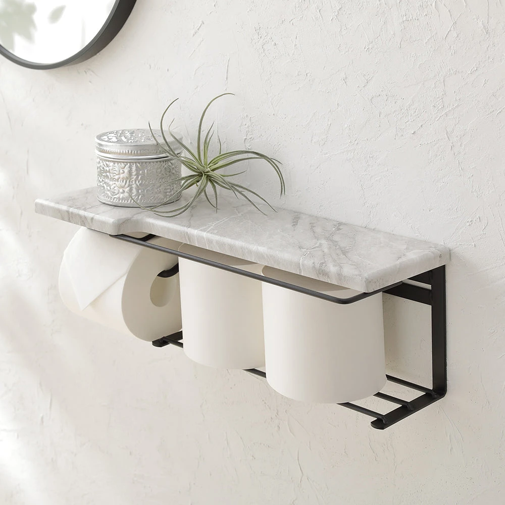 美しい木肌とタオルバーで整い、賃貸でも設置しやすいトイレ収納 大理石調 ブラック