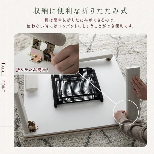 必要な時だけサッと広げ、使わない時は薄くたたんで省スペースに収まるこたつテーブル。動線を妨げにくい軽やかな設計で、模様替えや掃除の出し入れも負担になりません。天板は拭き取りやすく日々の食事や作業にも活躍。角の処理や脚部の当たりにも配慮し、床やラグをいたわりながら安定して使えます。落ち着いた佇まいでインテリアに自然に馴染み、季節外はローテーブルとしても心地よく使用可能。折りたたみの実用性とおしゃれな印象を両立し、小さな部屋でも快適な居場所をつくります。