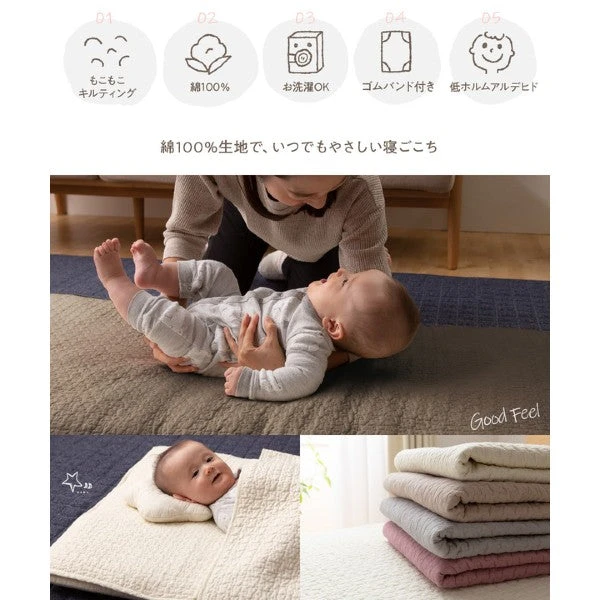 凹凸のあるキルティングが適度なクッション性を生み、ベースマットをやさしく保護。触れるたびにやわらかな感触で、ベビーの寝返りを妨げにくい使い心地です。