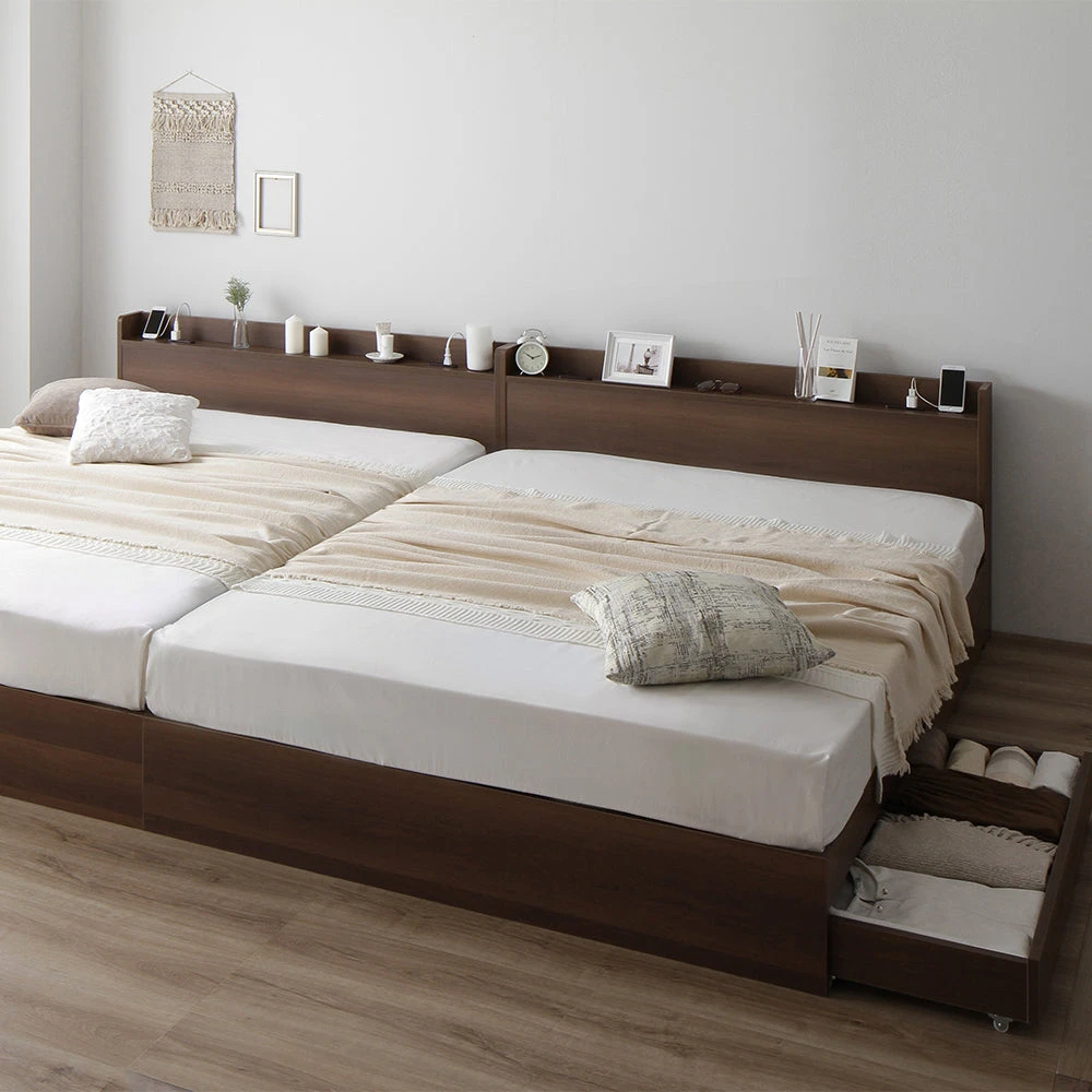 枕元には小物を置ける棚と電源口を用意し、寝前の充電や目覚ましの設置がすっきり収まります。足元側には可動しやすい引き出しを二杯備え、衣類やリネンを分けてしまえるため、取り出しが直感的で片付けが続きます。可動部は静かに動くつくりで夜間でも気兼ねなく扱え、しっかりした構造が日常使いの負荷に応えます。限られた空間でも通路を確保しやすい設計で、掃除の手間も少なく保ちやすい一台です。