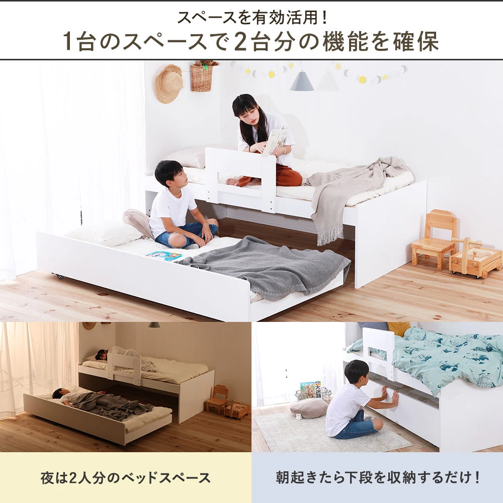 親子で一緒に眠れる安心感と、昼間は分けて使える自由度を両立した親子ベッド。就寝時は寄せて省スペースに、日中は分離して通路や遊び場を確保できます。掃除や換気がしやすく、寝具のローテーションも無理なく継続。模様替えや来客時にも配置変更がしやすく、限られた間取りでも動線が整います。ベッド下のスペース活用やメンテナンス性にも配慮し、日々の片付けが進む心地よい寝室づくりを支えます。