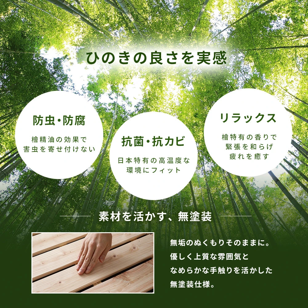木の香りがほんのり広がり、就寝前の緊張をやさしく和らげる落ち着いた寝環境を整えます。通気性に配慮したつくりで風の通り道を確保し、寝具にこもりがちな湿気を抑えて清潔を保ちやすいのが特長です。角や高さに配慮した本体は家族みんなにやさしく、音が出にくい安定感のある使い心地で夜間も静かに過ごせます。日々の手入れもしやすいシンプルな構造で、掃除や換気が負担になりにくく、長く付き合える一台として寝室づくりを支えます。