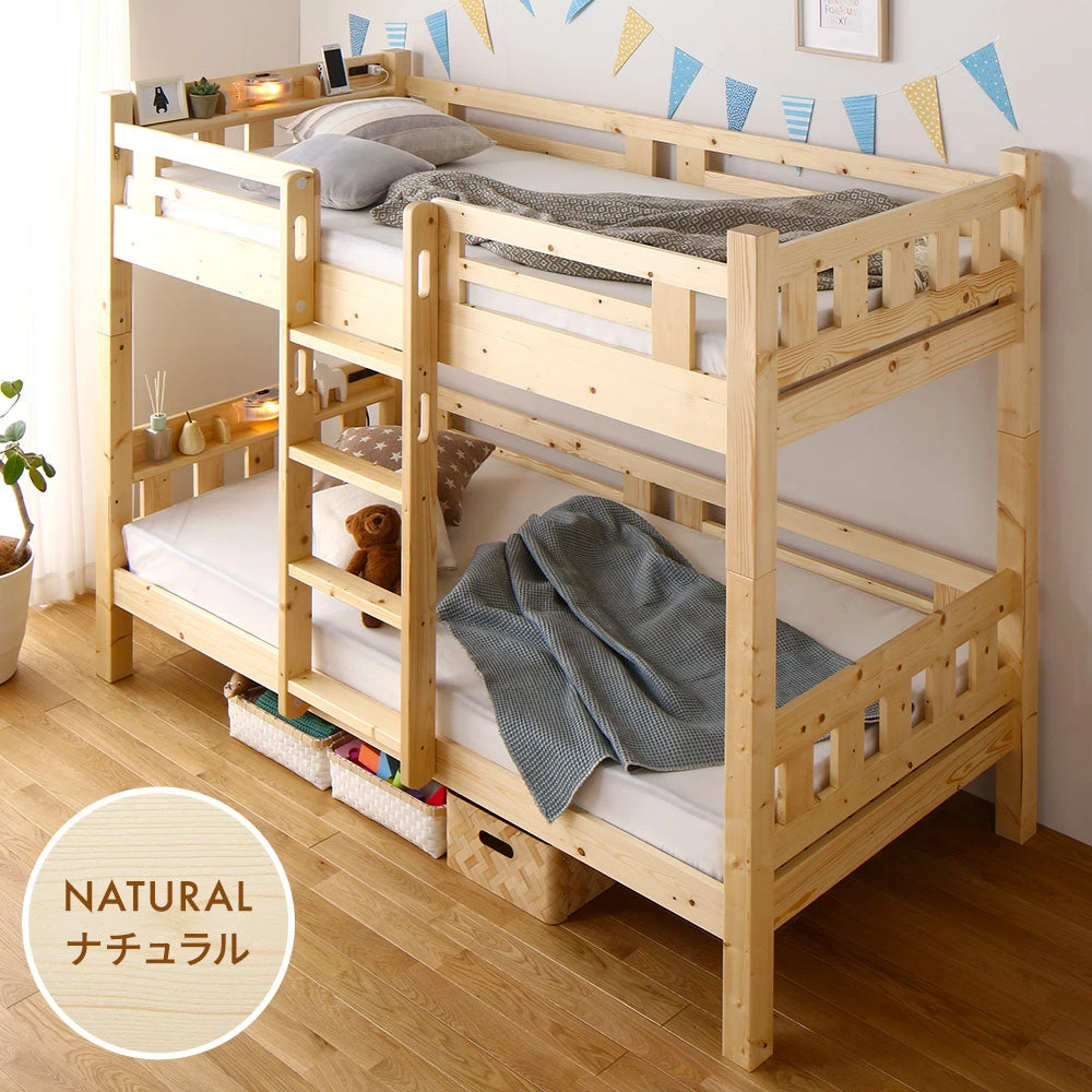 温もりあるパイン材と実用棚で整う暮らしの二段ベッド