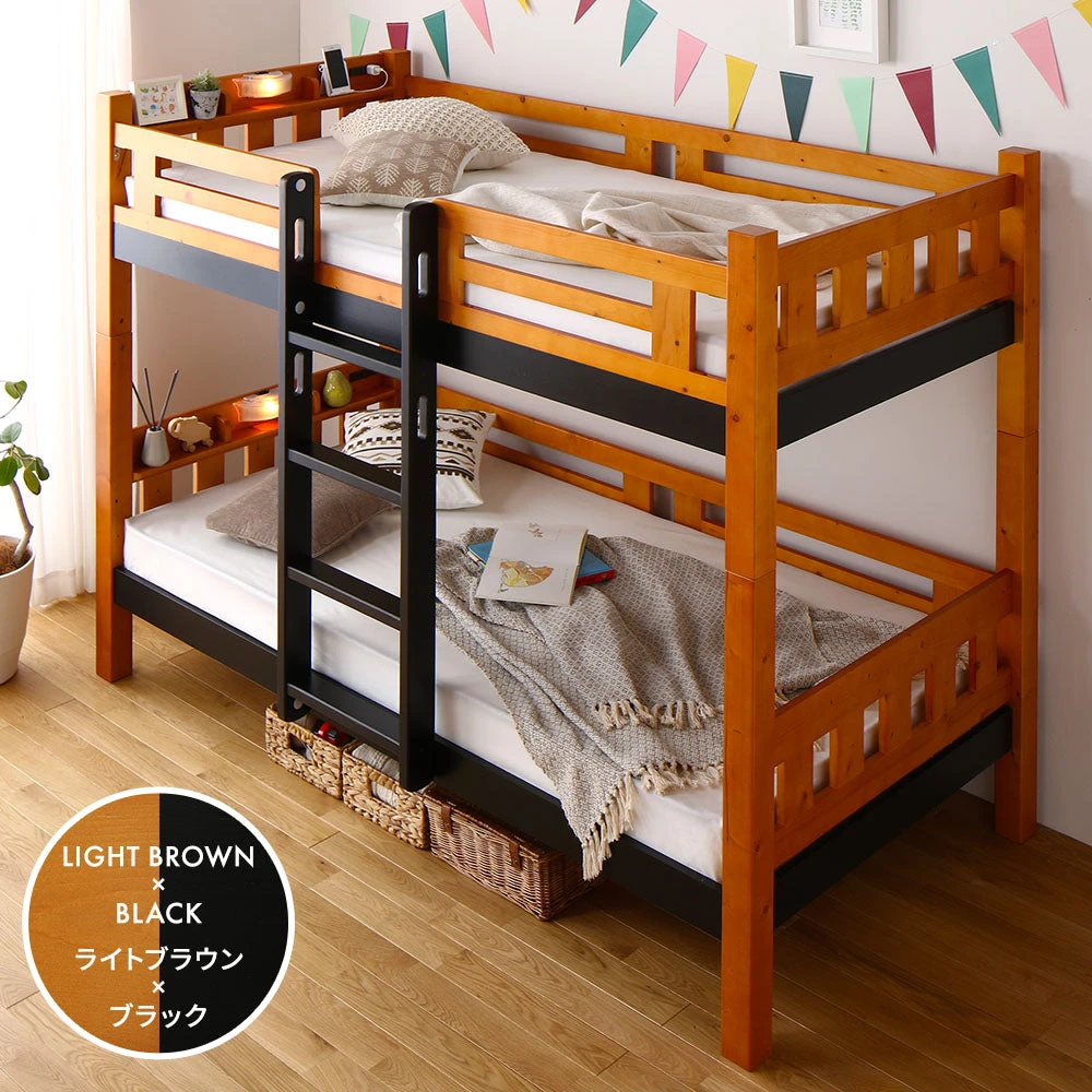 子どもの成長に寄り添う天然木2段ベッド ナチュラル ライトブラウン×ブラック お子様にも安心の頑丈設計 揺れを防ぐ頑丈なつくり 安心の垂直はしごを採用 照明 ・ コンセント付きのヘッドボード すのこ床で年中快適 ぬくもり感じる天然木 子供の寝顔が目線にくる高さ 分割できてシングルベッドとしても マットレス マットレス カラーバリエーション サイズ詳細 配送について 説明画像17 説明画像18
