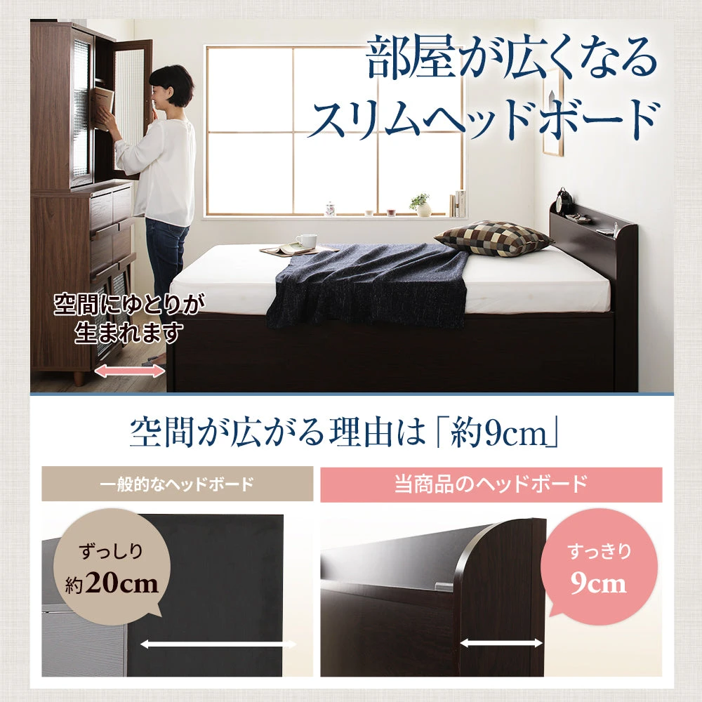 スリムな上部は小物を整えやすく、枕元がすっきりします。大きく開いてたっぷり入る一体型の収納は出し入れがしやすく、限られた空間でも床を広く使えます。静かに開け閉めできる仕組みで早朝や夜間も気兼ねなく扱え、ズレを抑える工夫や通気への配慮で清潔さも保ちやすい設計です。素材や部材は長く使うことを想定し、日々の掃除や手入れの負担を減らす形状に整えています。暮らしに寄り添う使い勝手を、見た目の落ち着きとともに両立させた一台です。