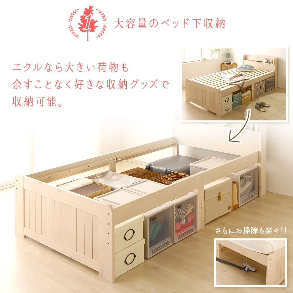 カントリー調×見せる収納。ベッド下を自由に使える / 見た目も肌触りもしっかり本物 / サラっと快適すのこ構造 エクルなら大きい荷物も余すことなく好きな収納グッズで収納可能。 ベッド下を自由に使える 、 3段階高さ調整可能 たっぷりと自分好みにかわいく収納。見た目も 、 肌触りもいい感じ 北欧家具のパイン材を使用。ヘッドボードは実用性もしっかり。 サラッと快適すのこ構造。 厳選したマットレス付きもご用意 サイズ表記。ベッドは通常丈とショート丈からお選びいただけます 選べる3色展開。ホワイトウォッシュ ・ ライトブラウン ・ ナチュラル 組み立て手順 説明画像11 説明画像12