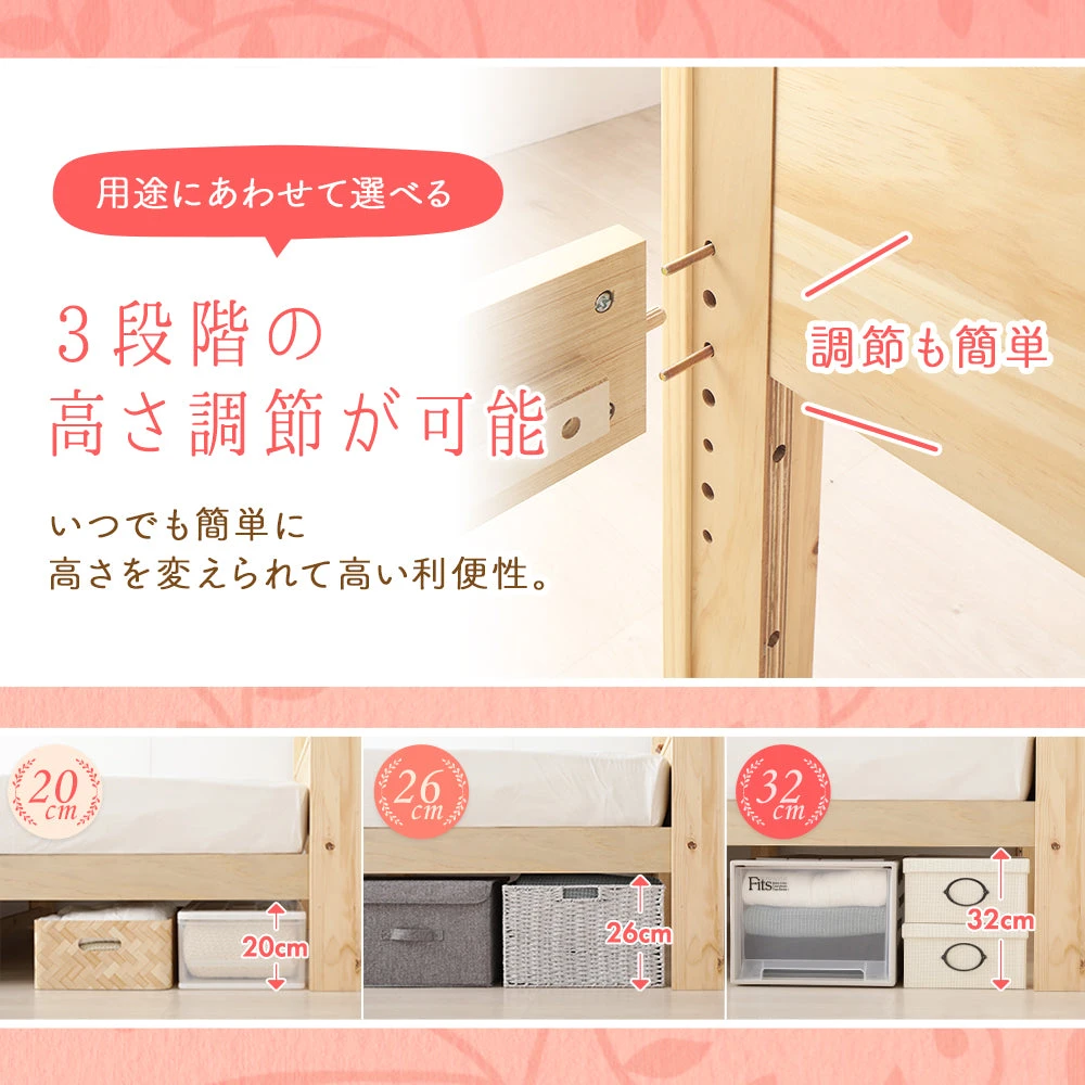 日用品を定位置化できる引き出しと、三段階の高さ調整で掃除や模様替えがしやすい構成です。枕元は小物をまとめやすい棚と電源を備え、就寝前後の支度がスムーズ。床面はすのこで通気を確保し、湿気をためにくい環境づくりを後押しします。天然木のやわらかな質感と直線的な意匠は空間になじみやすく、見た目の圧迫感を抑えます。実用性を軸に、清潔さ・使い勝手・落ち着きある雰囲気をバランスよく両立しました。