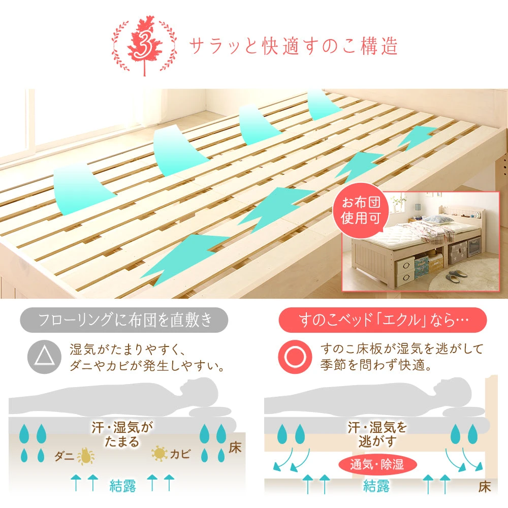 床面に通気の抜け道を確保し、湿気をため込みにくい設計。寝具の乾きやすさに配慮し、清潔な状態を維持しやすくします。