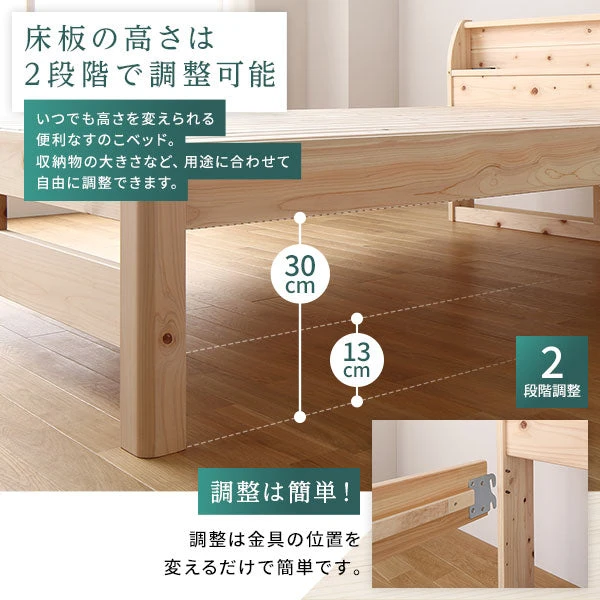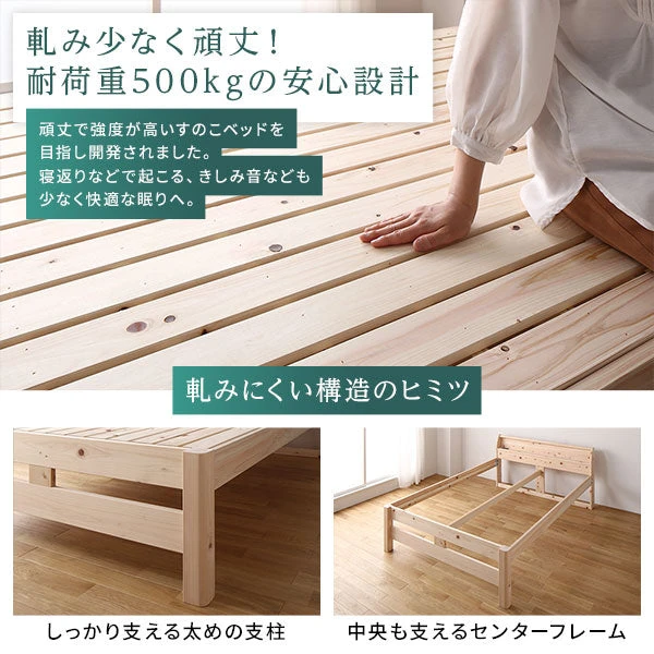 通気性に配慮した床面で湿気がこもりにくく、寝具を清潔に保ちやすいのが特長です。本体は日々の使用に耐える頑丈なつくりで、ぐらつきやきしみを抑えた安定感を確保。下部にはケース類も活用しやすい広いスペースがあり、季節物やリネンの置き場としても役立ちます。見た目はすっきりシンプルで、お部屋になじみやすいのも魅力。お手入れはホコリをさっと拭き取るだけで整えやすく、長く気持ちよく使い続けられる実用性にこだわりました。