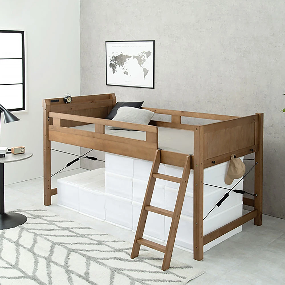 ベッド下の空間を活かして、収納スペースやセカンド寝床として使えます。 下にマットレスを置いて2段ベッドのように使うこともでき、部屋の使い方を広げられます。