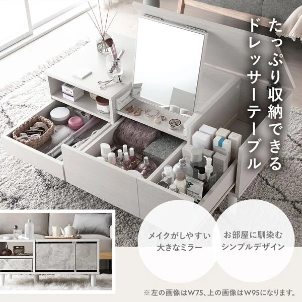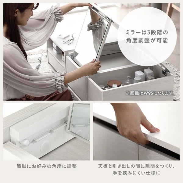 全身を確認しやすい大きな鏡と、手を伸ばせば届く位置にまとめた収納を組み合わせ、身支度の動線を短く整えます。よく使う道具は浅い引き出しや棚に、背の高いボトルは倒れにくいスペースへと仕分けやすく、戻す位置が明確になるため散らかりにくいのが特長です。天面は作業しやすい高さを意識し、座ったままでも出し入れが滑らか。見た目のすっきり感と使いやすさを両立し、毎日の準備が迷いなく進みます。日常の拭き掃除で整えやすく、清潔を保ちながら気持ちよく使い続けられるドレッサーです。
