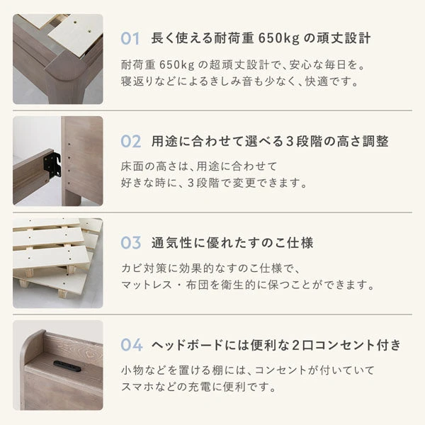 枕元に電源と棚を備え、就寝前後の動作がひとつの場所でまとまります。メガネや本、目覚ましなどの置き場が決まり、探し物が減って片付けが習慣化。配線の取り回しも考えやすく、ケーブルが絡みにくいのですっきり見えます。すのこ構造由来の通気性は湿気を逃しやすく、寝具のコンディション維持に貢献。きしみを抑えた安定感は夜間の音を減らし、落ち着いた時間を保ちます。日々の掃除は拭き取り中心で済み、清潔を保ちやすいのもポイント。限られたスペースでも導入しやすく、暮らしに自然となじむ機能的な選択です。