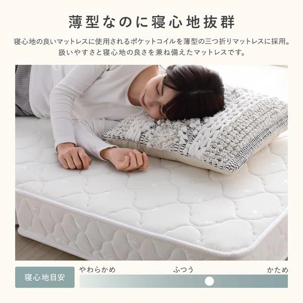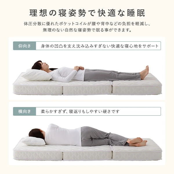 独立した支持構造が体を点で受け止め、寝返りしやすい快適さを日々安定して届けます。ふっくらとした感触でやさしく包み込みつつ、通気に配慮したつくりでムレを抑え清潔を保ちやすいのも安心。使わない時はすっきり片づけやすく、移動やお掃除も軽やかにこなせます。きしみ音が出にくい静かな使い心地と、長く使えることを見据えた耐久面への配慮まで。暮らしの中で扱いやすく、毎日の眠りを心地よく支える一枚です。