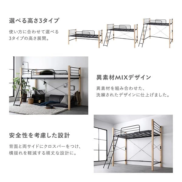 天井高や生活動線に合わせて高さを調整でき、限られた空間でも下部をワークスペースや収納として活用しやすいロフトベッドです。異素材ミックスの構造は、触れる部分の心地よさと要所のしっかりした強度を両立。通気や掃除のしやすさにも配慮し、日々の整頓とメンテナンスをラクにします。配置替えや模様替えにも対応しやすい実用性を備え、暮らしの変化に寄り添う一台を目指しました。