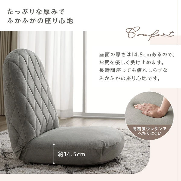 ペールトーンカラー ダイヤキルト リクライニング座椅子 ライトグレー ペールトーンカラー ダイヤキルト リクライニング座椅子 ホワイト ペールトーンカラー ダイヤキルト リクライニング座椅子 ペールピンク ペールトーンカラー ダイヤキルト リクライニング座椅子 ペールブルー お気に入りの場所って 、 こういうこと ・ 丸みのあるフォルムとかわいいステッチ ・ ふかふかの座面とハイバック設計 ・ 好きな角度でくつろげる14段階リクライニング ダイヤモンドステッチと丸みのあるフォルム たっぷりな厚みでふかふかの座り心地 ハイバックの背もたれで背中までゆったり すべて国内で仕上げた高品質なフロアチェア 14段階リクライニングでいろいろなくつろぎ 場所を取らずコンパクト収納もらくちん ふわふわ&すべらかで心地よい肌触り 後ろ姿も妥協しない可愛さは360度 ペールトーンでお部屋のアクセントに コンパクトだから 、 複数使いもおすすめ こたつと組み合わせてゆったりと ライトグレー ホワイト ペールピンク ペールブルー サイズ詳細 説明画像22 説明画像23