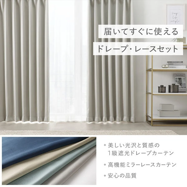 上品な光沢を持つドレープが窓辺を格上げしながら、一級遮光でまぶしさと寝室の明るさをしっかりコントロール。高機能ミラーレースは日中の視線をやわらげ、室内の明るさはそのままに。UVカット率70%で家具や床の日焼け対策にも役立ちます。自宅で洗濯できる から、花粉やホコリの季節も清潔をキープ。取り付け後すぐに使え、毎日の暮らしに快適さと安心感をもたらすシリーズ共通設計です。