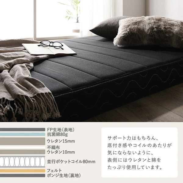 独立したポケットコイルが体の曲線にそって点で支え、体圧をきれいに分散。薄型でも底付き感を抑えた安定した寝心地で、自然な寝姿勢へ導きます。空気が循環しやすい通気設計により湿気や熱をため込みにくく、季節を問わずさらりと快適。寝返りもスムーズで、肩や腰への負担が偏りにくいバランスです。扱いやすい厚みで設置や移動もスムーズ。日々のお手入れはシーツやベッドパッドの併用で清潔を保ちやすく、気持ちよい眠りの環境づくりを支えます。