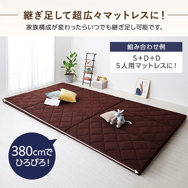 折りたたんで片付けやすい三つ折り構造は、日中の生活空間を広く使いたいときにもスムーズに切り替えができ、動線を崩しません。就寝時は体をしっかり受け止める安定感で理想の姿勢へ導き、静かな寝返りを助けて家族の眠りを妨げにくくします。必要に応じて連結して超広々に拡張できるため、成長や来客にも柔軟に対応。通気やお手入れ性にも配慮し、清潔と快適を日常的に維持しやすいファミリータイプ マットレスです。