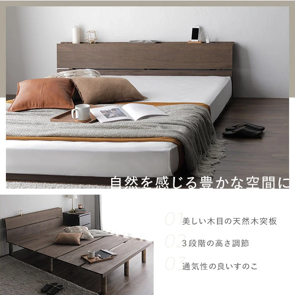 天然木のやさしい質感が空間に落ち着きを与え、日々のくつろぎに自然となじみます。高さは段階的に調整でき、掃除のしやすさや寝具の出し入れのしやすさを状況に合わせて最適化可能。床面は風が通りやすい構成で、湿気がこもりにくい環境づくりを助けます。派手な装飾を避けたベーシックな佇まいは流行に左右されにくく、長く使えるのも魅力。日常の手入れは乾拭きを中心に気軽に行え、清潔を保ちやすい設計です。静かな使用感と安定感に配慮し、落ち着いた寝室づくりを支えます。