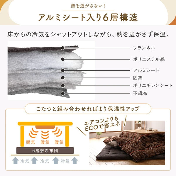 起毛生地と中間層が空気を含み、体温のぬくもりをキープ。こたつの熱も効率よく受け止めて足元からじんわり温め、冷え込みやすい時間帯も安心して過ごせます。