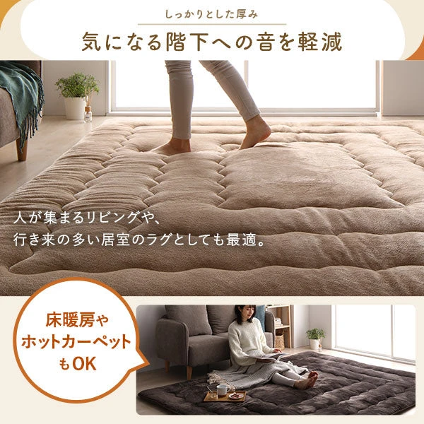 ふっくらとしたボリュームが床の冷えをやわらげ、こたつの熱を逃がしにくくすることで、腰掛けた瞬間から足元までじんわり温もりが続きます。なめらかな触感は肌にやさしく、くつろぎ時間をより快適に。敷くだけの手軽さでリビングの印象も落ち着き、日々の掃除は掃除機や粘着ローラーで簡単にお手入れできます。季節の切り替え時も折りたたんで省スペースに収納しやすく、家族の団らんや一人時間を心地よく支える一枚です。