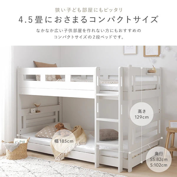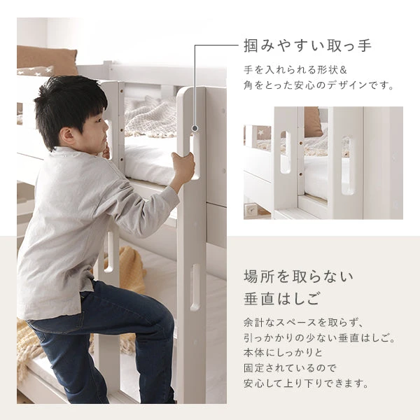 限られたスペースでも動線を確保しやすい設計で、ベッドまわりの出入りがスムーズになります。上下の居場所をきちんと分けつつ圧迫感を抑える配慮により、学習や就寝の切り替えがしやすい環境づくりを後押し。日々の掃除やシーツ交換の手順も見通しやすく、家事負担の平準化に役立ちます。搬入経路を意識した構造で導入時の不安も軽減し、長く使い続けられる堅実なつくりで安心感を高めます。