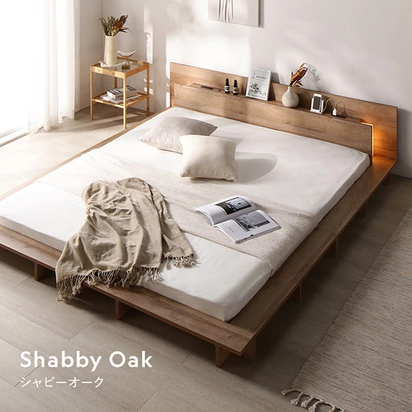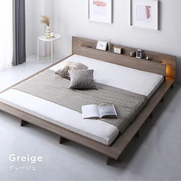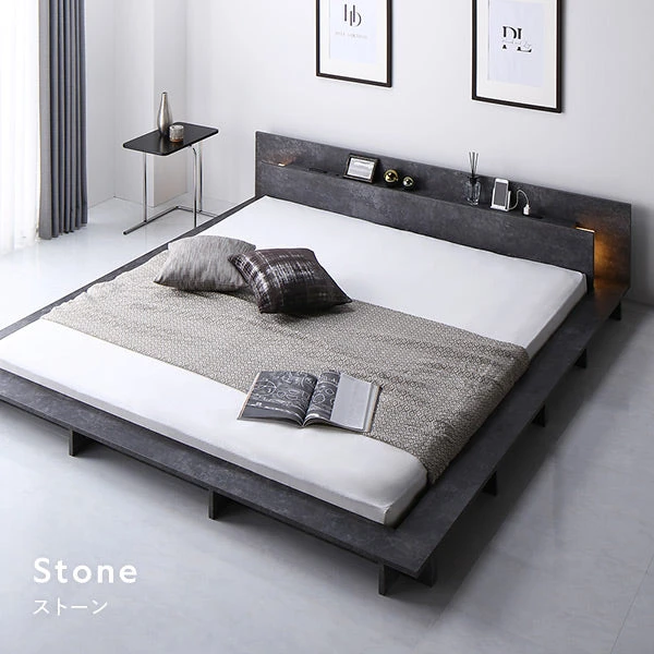 床面の高さを抑えたステージ形状が視線を遮らず、寝室にゆとりを生みます。枕元のやわらかな光は必要な範囲だけをそっと照らし、就寝前の読書や身支度も落ち着いて行えます。フラットで凹凸の少ない造形はシーツ交換や日々の掃除がしやすく、埃のたまりを抑えて清潔を保ちやすいのも特長。配線が目立ちにくい納まりで見た目のノイズを減らし、静かな雰囲気を演出します。低重心の安定感が圧迫感を和らげ、床座の暮らしにも自然に馴染む、扱いやすさと寛ぎを両立したベッドです。