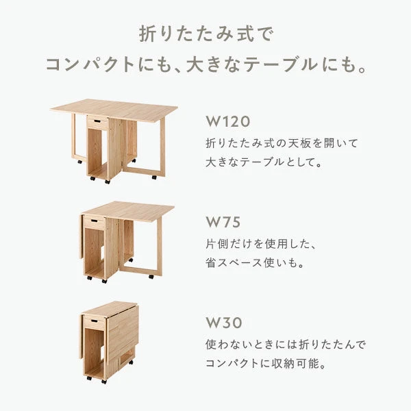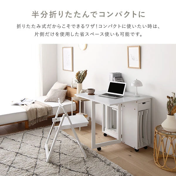 使わない時は折りたたんで壁際や隙間へ収納可能。見える物量を減らして空間の印象を整え、生活感を抑えた落ち着きあるダイニングを演出します。