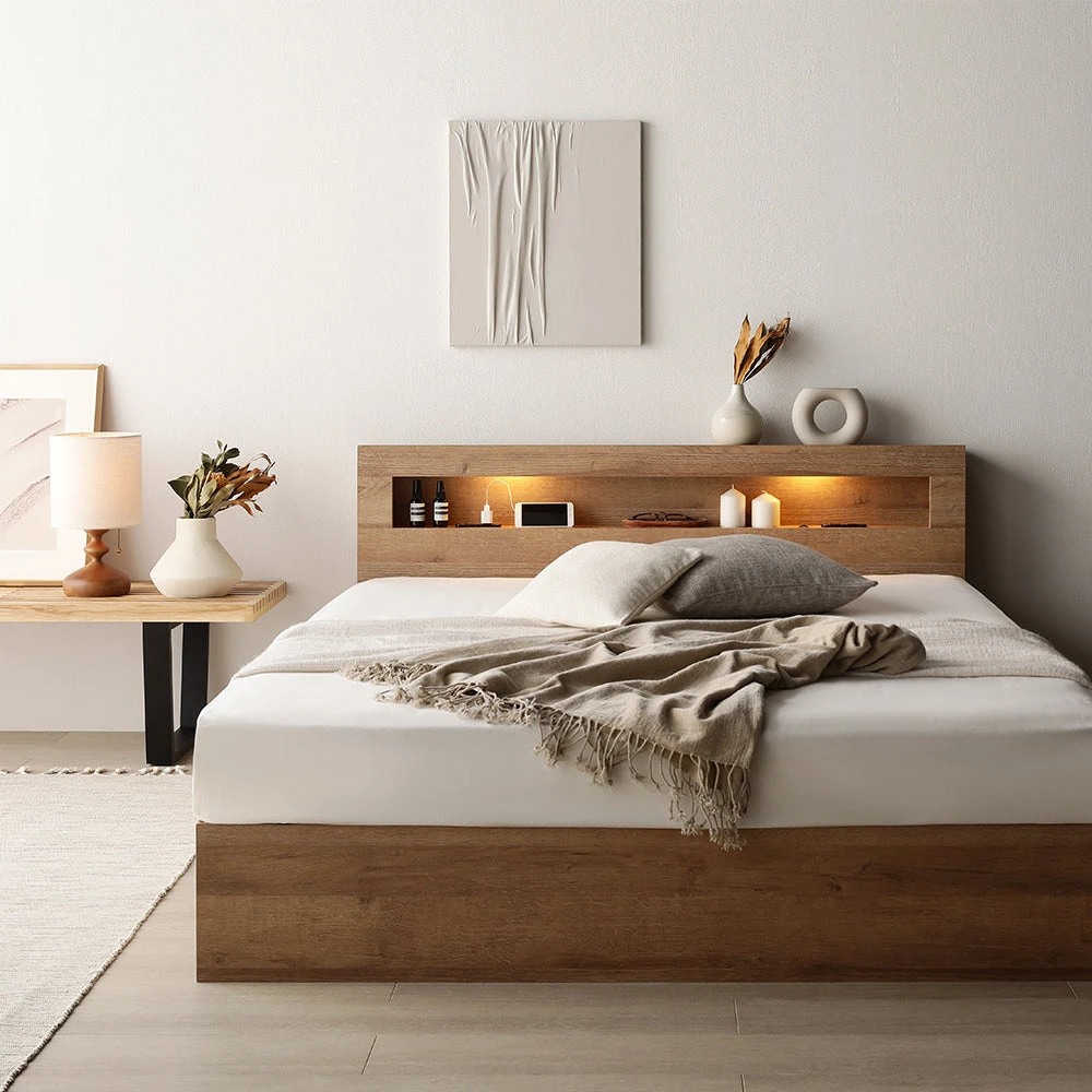 就寝前後に手に取りたい小物は枕元の棚へ、かさばる衣類やリネンは引き出しへと分けて収められる構成で、寝室の生活動線を乱さずすっきり保てます。手元をやさしく照らす灯りは読書や身支度を快適にし、夜間の移動も安心。定位置が決まることで置きっぱなしを減らし、掃除や片づけの負担も軽減します。限られたスペースでも必要な物がすぐ届く使い勝手を備え、日々の暮らしに無理なく整頓習慣を根づかせる設計です。