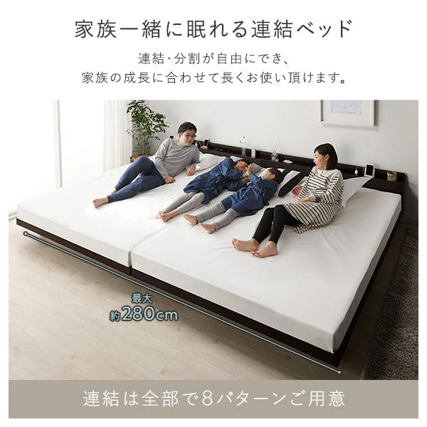 最大約280cmまで連結できる柔軟な設計で、家族が並んで眠れる広さと安心感を両立します。土台は頑丈でしっかりとしており、体重移動のたびに安定して支えるため、夜間のきしみや揺れを感じにくい静かな環境を保ちます。床面はすのこ構造で通気性に優れ、湿気や熱をため込みにくく、カビやにおいの発生を抑制。清潔で心地よい寝具環境づくりをサポートします。さらに高さを調整できるため、暮らしの動線や掃除のしやすさに合わせたレイアウトが可能。木の質感をいかした落ち着いた意匠で、日々の眠りにやさしく寄り添います。