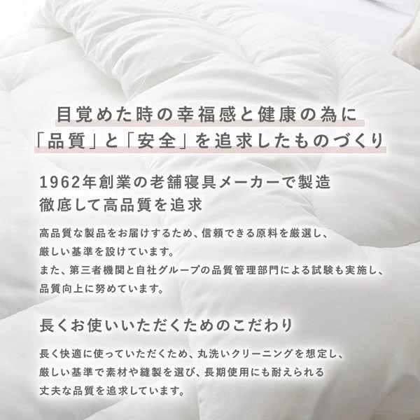ホコリの出にくい中わたが寝室の空気を乱しにくく、洗濯機で丸洗いできるから日々の清潔管理が無理なく続きます。雲のように軽い掛け心地は寝返りを邪魔せず、体にふわりと沿ってあたたかさを保ちます。肌側はさらさらと心地よく、内側はもちもちとした弾力で隙間をつくらず、朝まで快適。扱いやすい軽さは干すときや片付けの負担も軽減し、季節の変わり目にも使い勝手よく活躍します。日常に寄り添う機能性とやさしい触感で、清潔で快適な睡眠環境づくりを支えます。